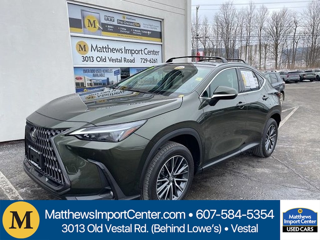 Green 2025 Lexus NX 350h Premium AWD CVT 2.5L I4 DOHC 16V41/37 City/Highway MPGMatthews Import Center promises each customer a thorough and confident 120-point inspection on our used inventory guaranteeing a relaxing and peace-of-mind experience. We are located behind Lowes in Vestal NY. Or call us at (607) 729 - 6261 Matthews Import Center 3013 Old Vestal Road Vestal NY 13850.